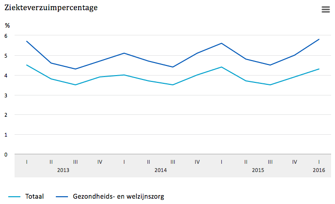 In de gezondheids- en welzijnszorg is het ziekteverzuimpercentage hoger dan het gemiddelde verzuim in Nederland. Het CBS meldt dat het verzuim in het eerste kwartaal van 2016 in de zorg 5,8 procent was. Dit is 1,5 procentpunt hoger dan het gemiddelde verzuim. Een groot verschil sinds eind 2005.